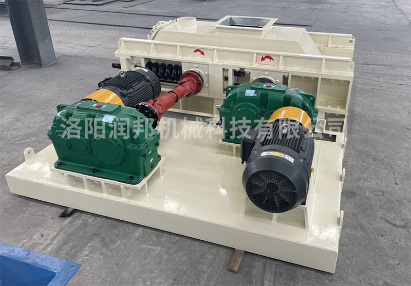 電機通過聯(lián)軸器、減速機減速,通過聯(lián)軸器分別帶動固定輥部和活動輥部轉(zhuǎn)動工作,機架部起主、被動輥部支承作用。被破碎的物料經(jīng)機架部進入兩輥的空間內(nèi),使物料受擠壓、研磨而被破碎,經(jīng)機架下部排出機體。