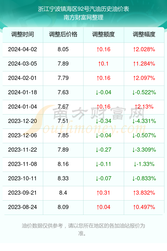 本文旨在為廣大車主提供關(guān)于寧波地區(qū)92號汽油的最新價格動態(tài),深入分析油價波動的原因及影響因素,并預(yù)測未來可能的趨勢,以下是詳細內(nèi)容: